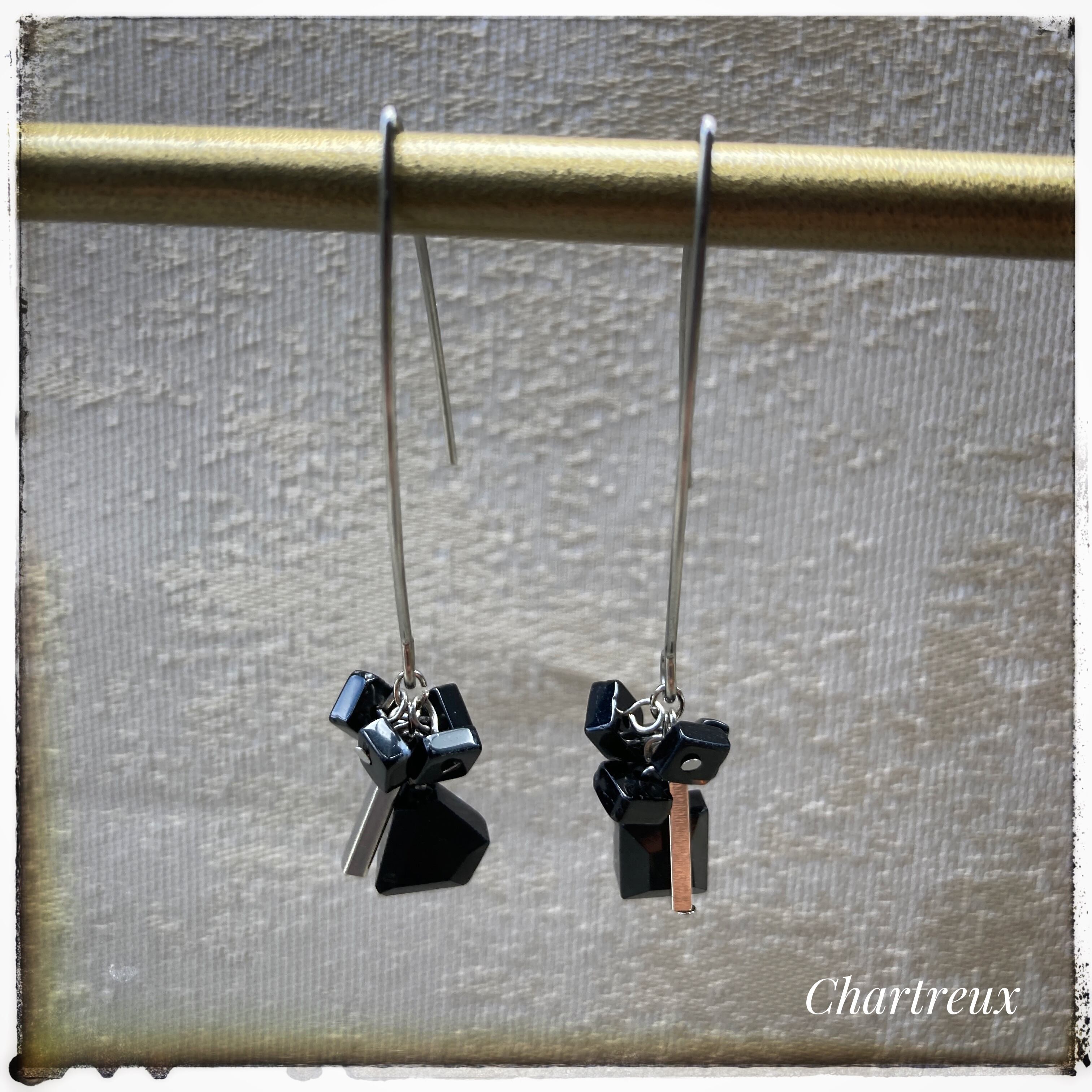 ブラックスピネルとオニキスの組み合わせが優しい輝きを放つピアスです。またメタルのロングビーズがアクセントに輝きます。