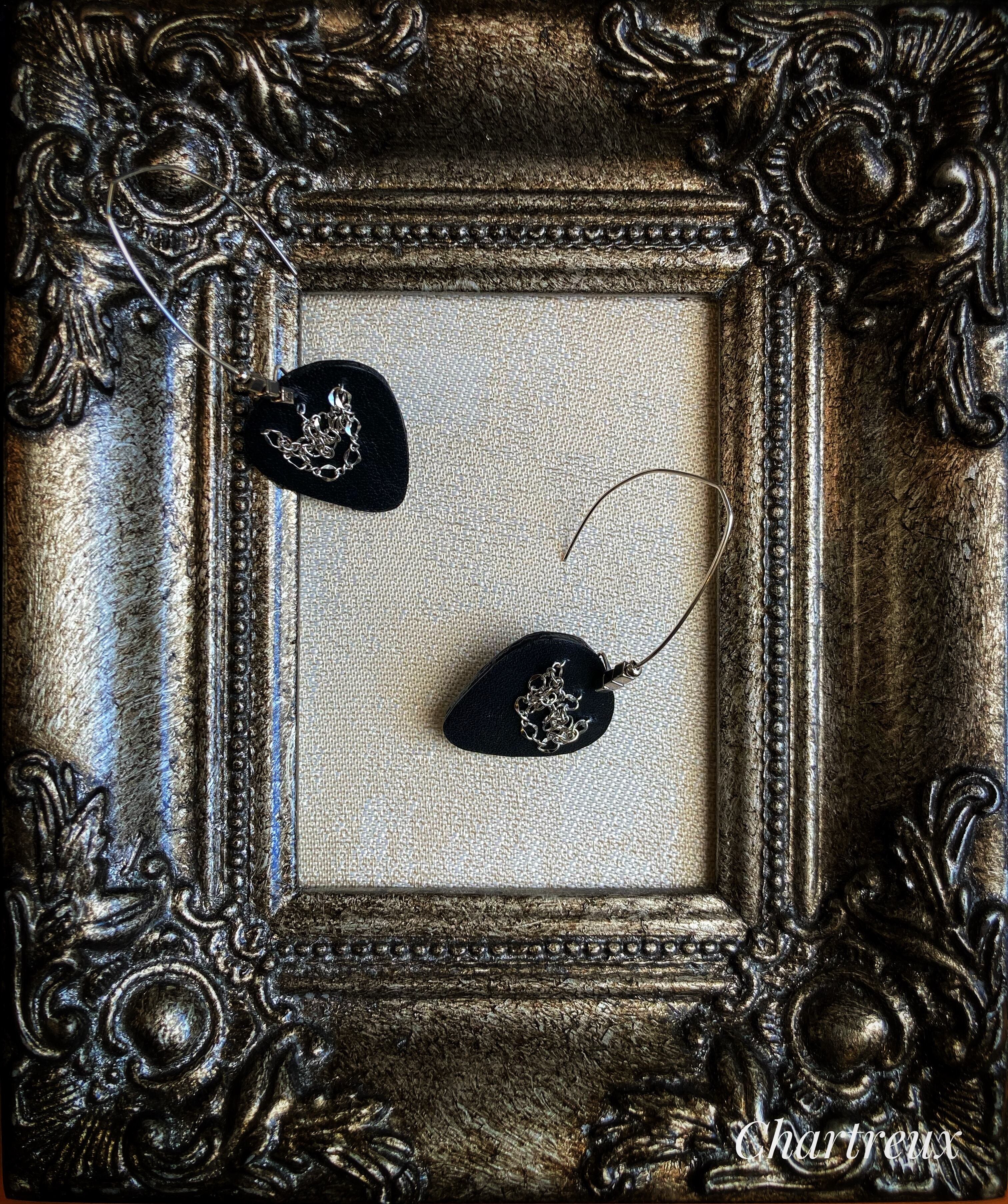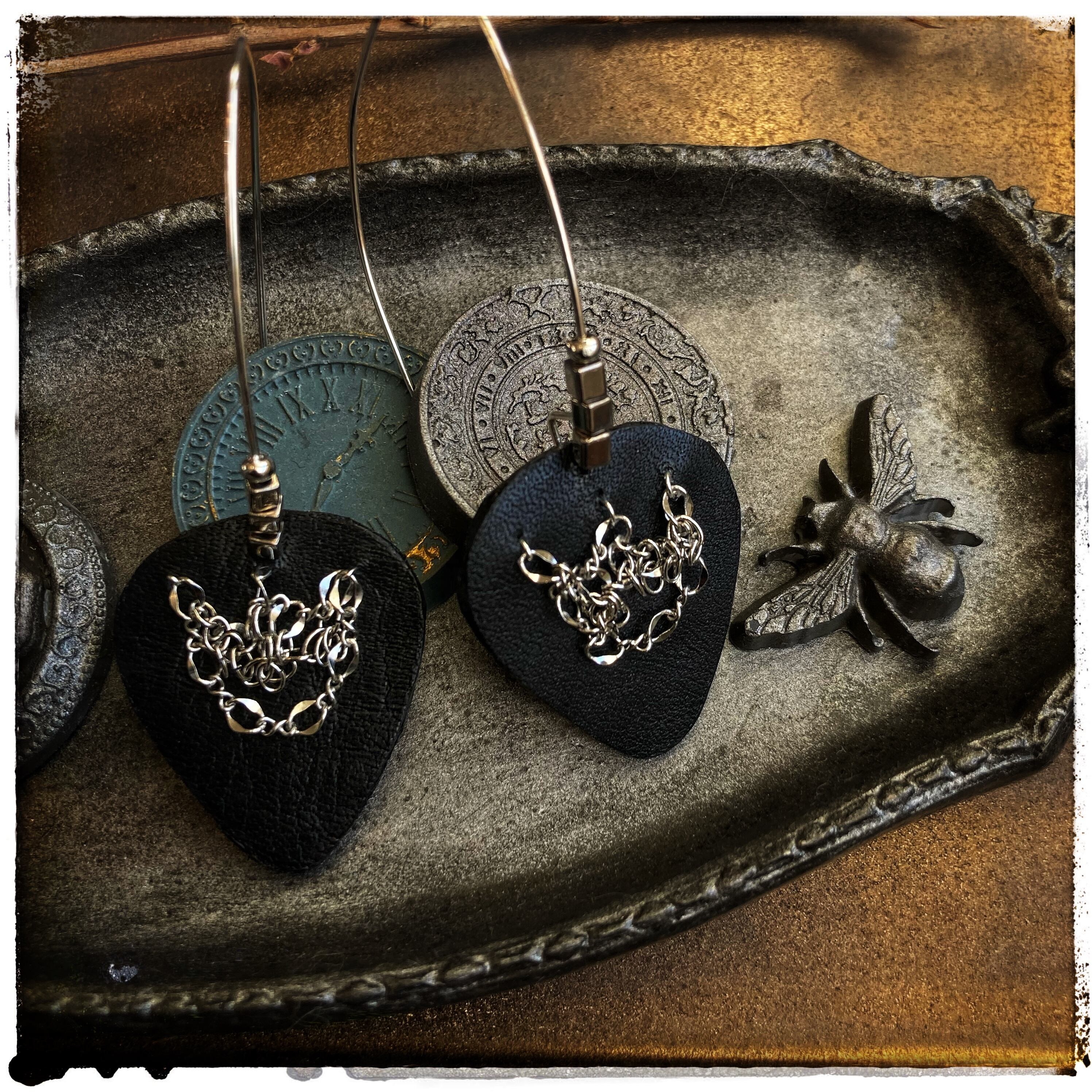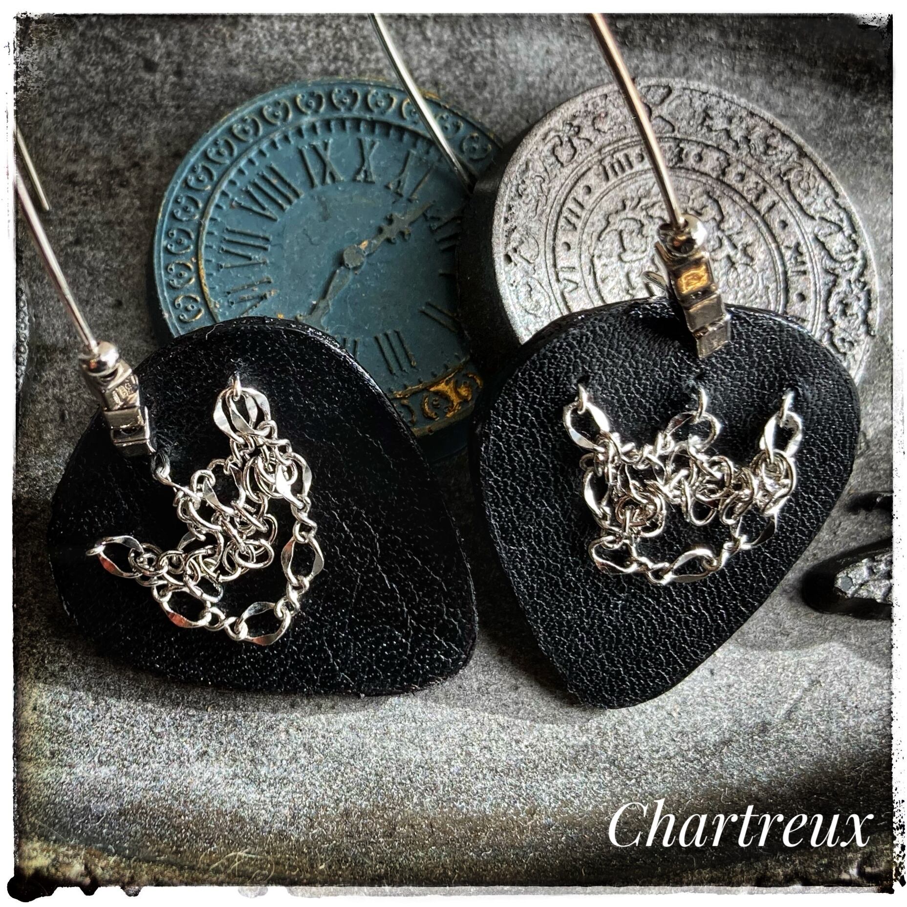 革素材を使ったギターピック型のピアスです。パンクロックの雰囲気を醸し出すチェーンが個性的なスタイルを演出します。主張が強く、周囲の視線を引きつけるデザインです。